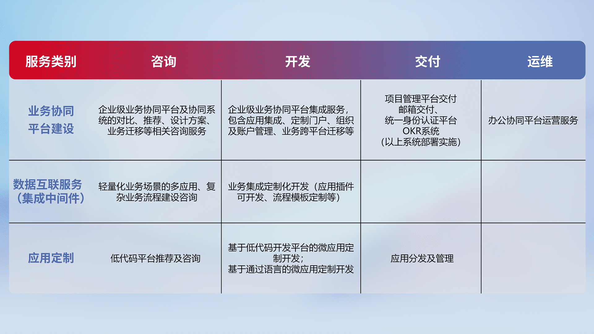 针对钉钉、、企微、、、、IDaas等平台级产品提供产品的规划、、、方案、、、交付、、定制化开发等服务,,实现如统一协同办公、、智能客户服务、、、混合会议管理、、智能数据查询、、、、等业务场景,,实现数字化转型。。。。